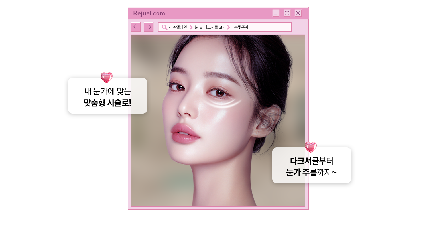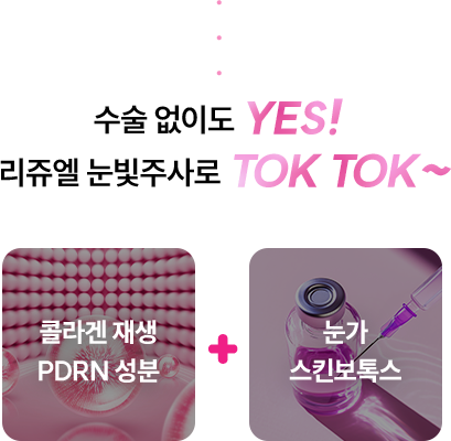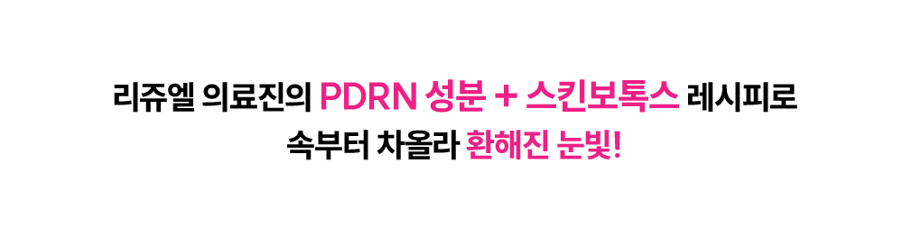 리쥬엘 의료진들의 오랜 임상 경험을 통해 개발된 눈빛주사의 레시피는 PDRN 성분이 눈 밑 손상된 피부 조직을 재생시키고, 스킨보톡스 성분을 통해